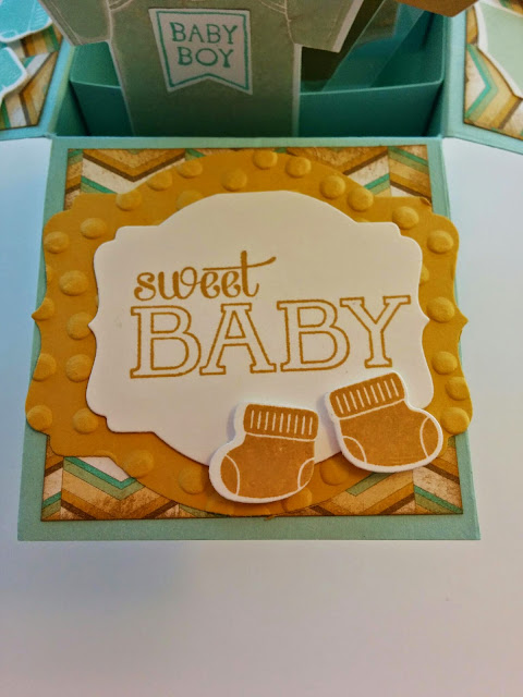 For today's Wow project, I wanted to share a Card in a Box. This card is so easy and fun to make. With the fantastic Designer Series Paper combined with great stamps and framelits, I could make so many of these! Here is a baby themed card.